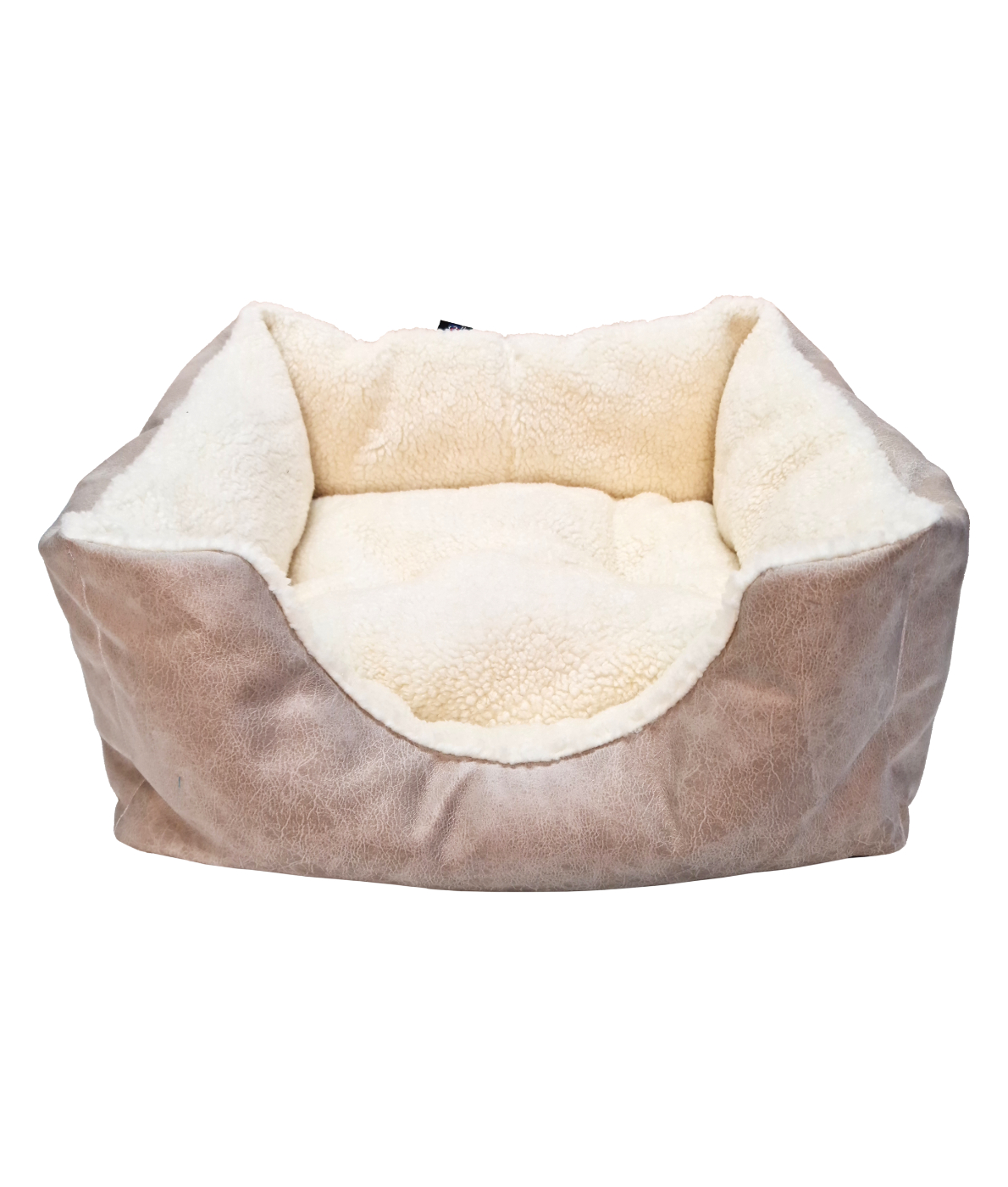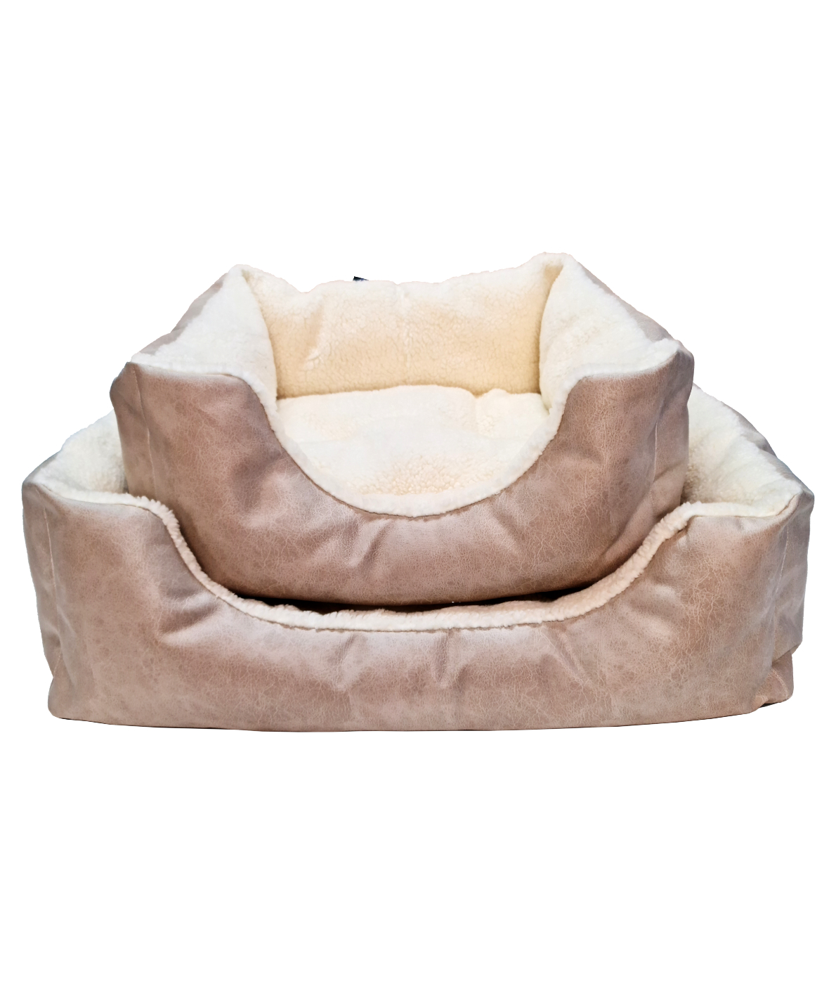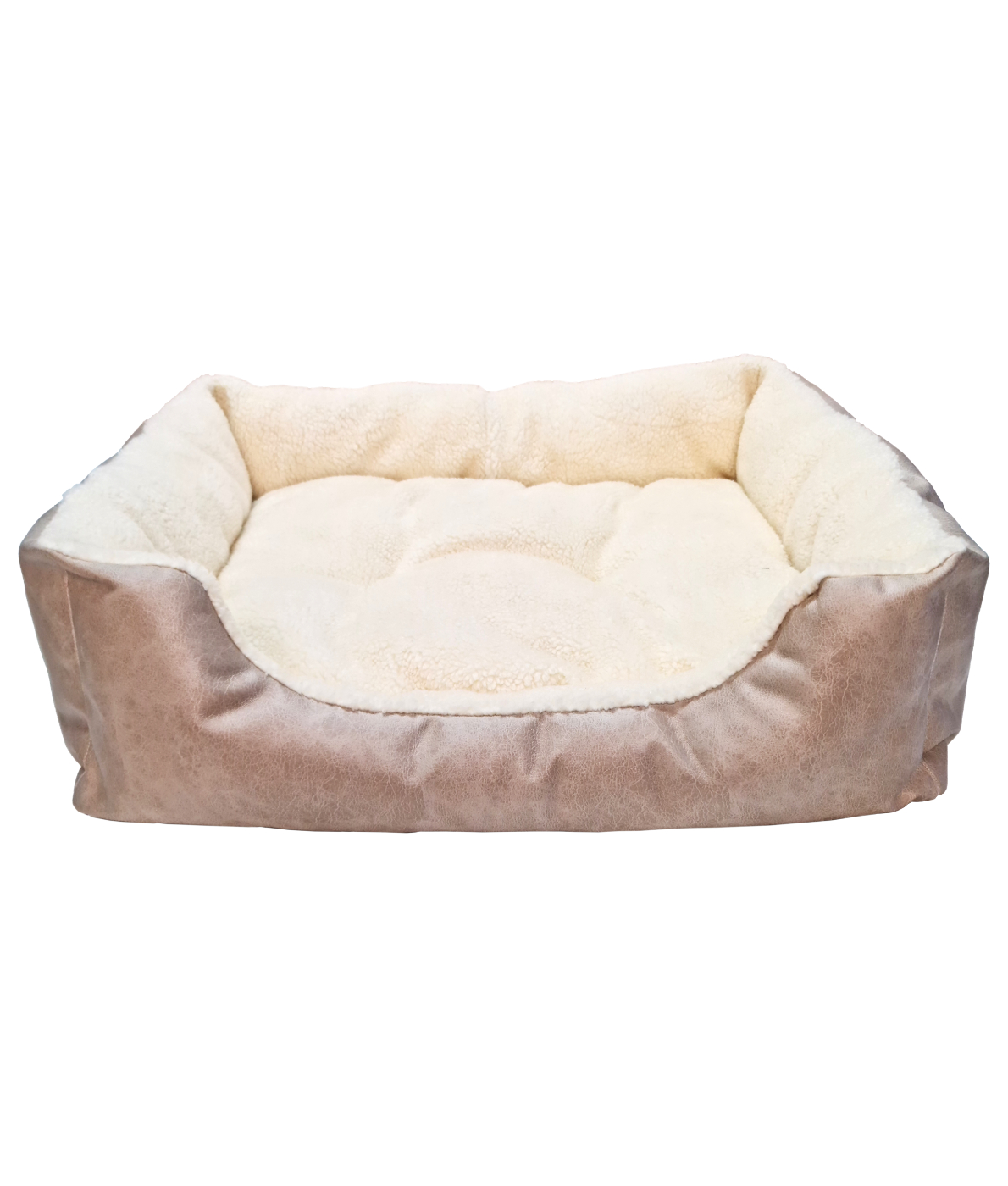 This particular bed has Leatherette outer and a soft cream fleece inner, the cushion base is removable and made from the fleece fabric.